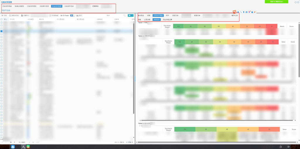 系统提供基本信息、业务类型及交易条件、信用额度设置、财报、评级标准、附件、操作记录等方面的详情管理,并展示交易对手风控状态,包括可使用和冻结等。